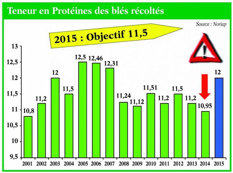Pour cette année, l’objectif de Noriap est que le taux de protéines moyen de ses blés atteigne 11,5 % de protéines (Cf graphique). Nous prions nos lecteurs ainsi que les dirigeants de la coopérative d’accepter les excuses du journal pour cette annonce erronée.