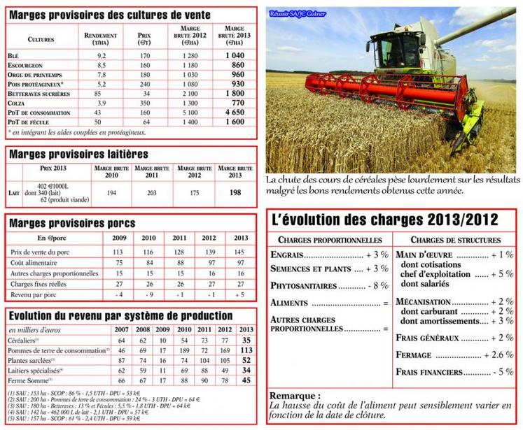 La conjoncture de tous ces facteurs réunis abouti à générer des résultats en berne, et ce quel que soit le système «type» de production. Ainsi en va-t-il pour le système «céréales», qui chute à 35 k€ de résultat d’exploitation sur la récolte 2013 contre 77 k€ en 2013 (-55%), le système «pommes de terre de consommation» qui passe de 169 à 113k€ (-33%), le système «plantes sarclées» qui passe de 105 à 524 k€ (-50%) et enfin le système «lait» qui passe de 49 à 34 k€ (-31%). En moyenne, la Ferme Somme passe ainsi de 78 à 45 k€ de résultat (-42%), ce qui reflète globalement ces tendances liées principalement au tassement de rentabilités des productions végétales.