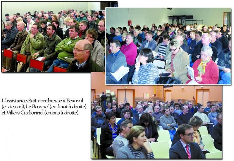 Après avoir fait salle comble à Grand Laviers la semaine dernière (voir notre précédente édition), les trois autres réunions d'information consacrées à la réforme de la PAC organisées par la Fdsea avec le concours de CER France Somme ont également suscité l'intérêt de nombreux agriculteurs à Beauval, Villers-Carbonnel et Le Bosquel. Pour chacune de ces réunions la typologie d'exploitation représentée était très variée, reflétant ainsi le tissu agricole du département. Il n'en demeure pas moins deux constantes communes : la réforme risque d'être très dure pour tous les systèmes d'exploitation du département, et ce notamment dès 2015; d'autre part, la souplesse des systèmes pour capter chaque année les marchés favorables et s'inscrire dans toutes les opportunités de développement possibles seront des axes d'évolution prioritaires pour chacun.