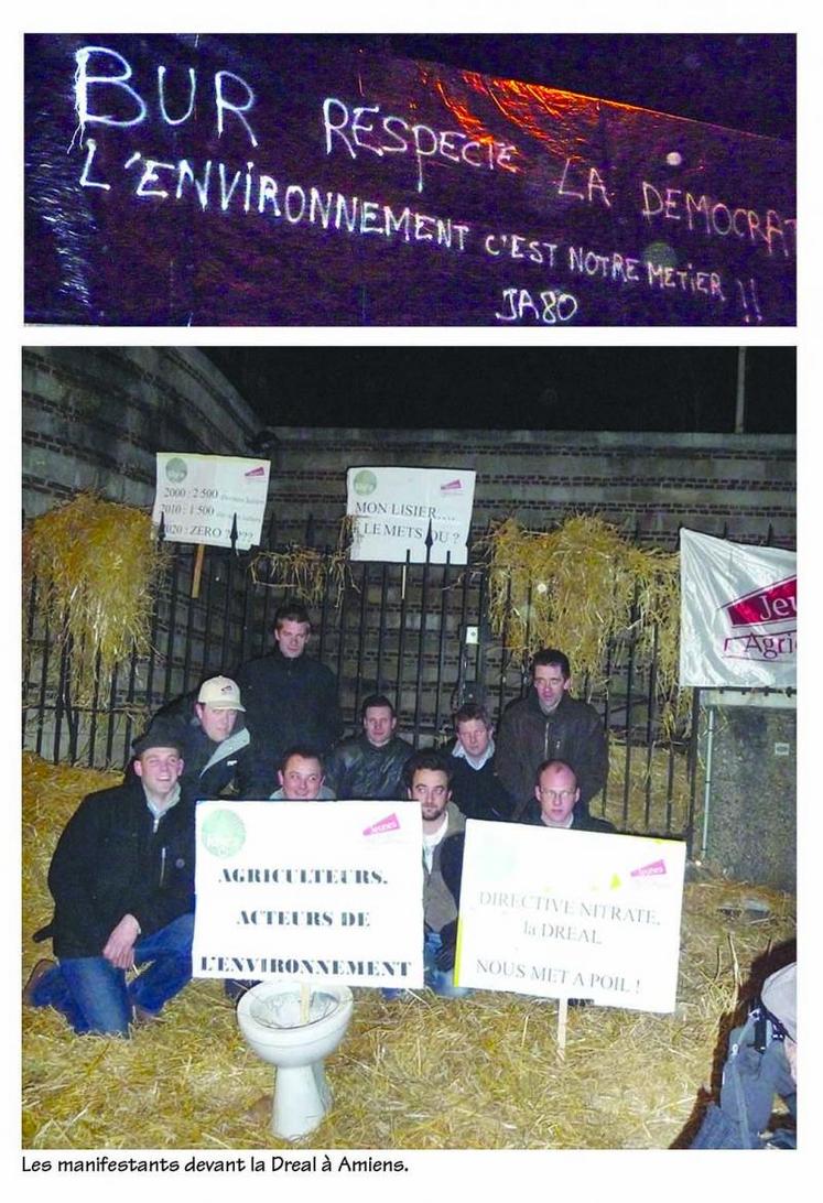 Après avoir éparpillé du fumier dans Amiens le 10 janvier dernier avec la Fdsea, les Jeunes Agriculteurs ont décidé de faire une action coup de poing mercredi 16 janvier devant la Dreal (Direction régionale de l’environnement, de l’aménagement et du logement). Une vingtaine d’agriculteurs se sont donc retrouvés vers 21h30 sur les trottoirs d’Amiens pour éventrer des ballots de paille et tendre des drapeaux et des panneaux avec comme slogan «Bur respecte la démocratie, l’environnement c’est notre métier !».