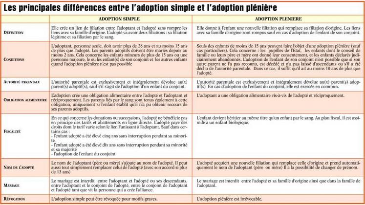 Dans les deux cas, l'adoptant exerce l'autorité parentale, mais les autres conséquences sont totalement différentes. Seule l’adoption plénière fait définitivement entrer un enfant dans une famille d’adoption et coupe tout lien avec sa famille d’origine.