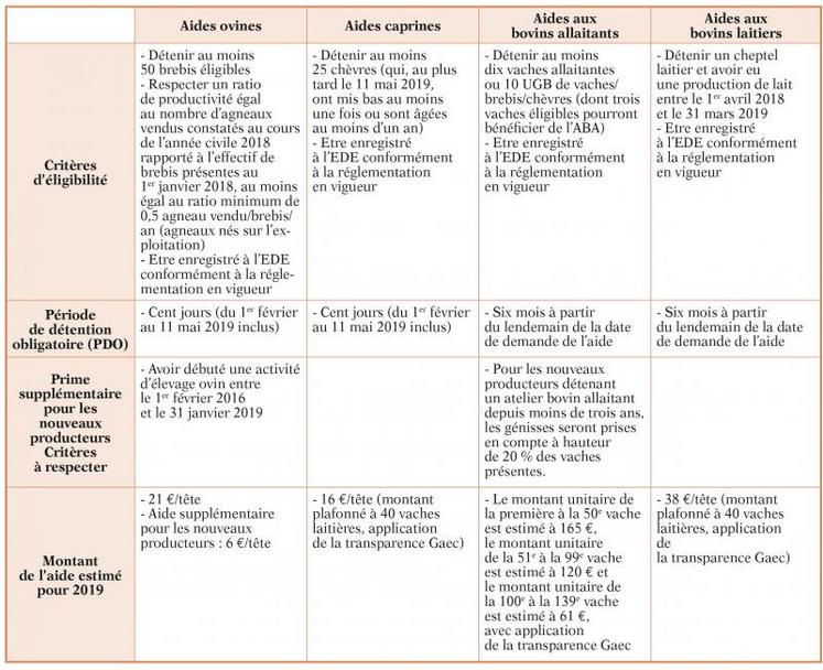 Le tableau ci-dessus reprend les critères d’éligibilité et les périodes de détention obligatoire à respecter pour prétendre à ces aides, ainsi que les éventuelles aides supplémentaires pour les nouveaux producteurs et les montants estimés par tête, pour 2019, à titre indicatif.