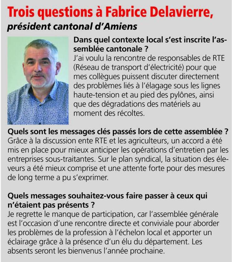 Neuf participants à l’assemblée générale du canton d’Amiens étaient réunis le 4 février à Argœuves, commune de Fabrice Delavierre, président cantonal, en présence de Xavier Flinois, vice-président de la FDSEA, pour une réunion animée. Dans un premier temps, la discussion a eu pour objet l’entretien des pylônes électriques qui est à la charge de RTE (Réseau de transport d’électricité). Deux griefs majeurs ont été exposés aux représentants de RTE, Patrice Billet, coordonnateur environnement dans les domaines «végétation» et «peintures», et Nicolas Dumont, chargé de la maintenance sur Amiens. «Nous ne sommes pas prévenus quand une intervention pour l’élagage est prévue et les résidus de bois ne sont pas enlevés», ont expliqué plusieurs participants.