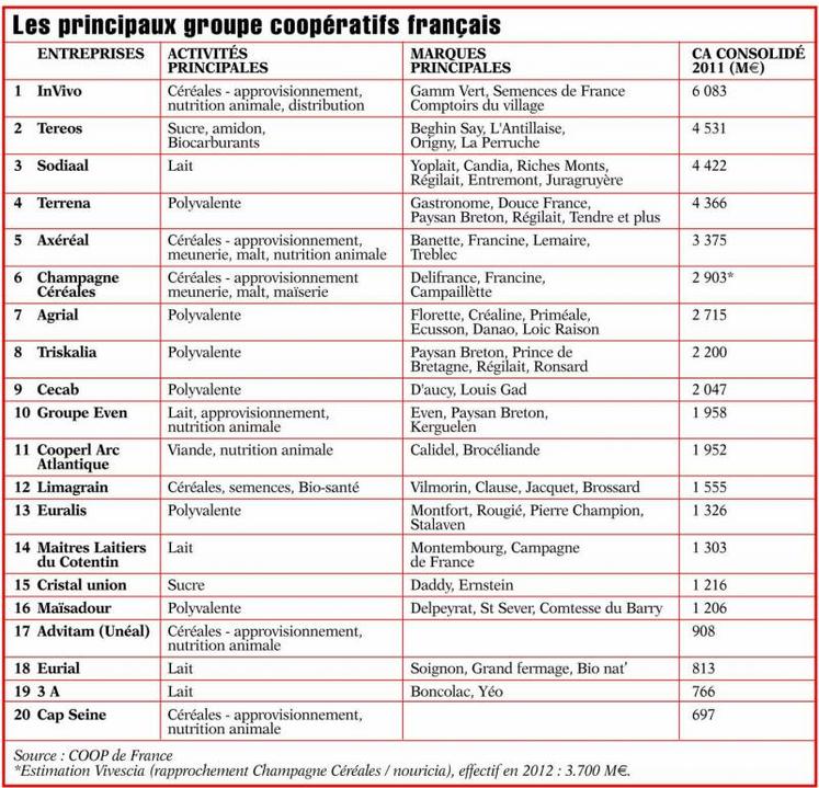 InVivo, de la filière céréalière, le plus gros de tous les groupes coopératifs compte un chiffre d’affaires consolidé de 6 milliards d’euros en 2011, suivi par Tereos (4,5 milliards d’euros) pour le sucre, l’amidon et les biocarburants et Sodiaal pour le lait (4,4 milliards d’euros). Derrière ces noms se cachent des marques connues : Gamme Vert, Beghin Say, Yoplait, Candia … (voir tableau) «Les consommateurs ne savent pas que des coopératives sont derrière ces marques», déplore Philippe Mangin, président de Coop de France. La coopération française reste «présente mais pas leader» au regard de l’Europe. Aux Pays-Bas, par exemple, la coopérative laitière Friesland Campina pèse 9,6 milliards d’euros.