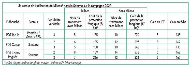 De manière générale, sur la campagne 2022, l’OAD nous a permis de réduire l’équivalent de cinq passages fongicides en fécule là où les variétés sont moins sensibles mais ont un cycle de végétation plus long. En pomme de terre de consommation, que les parcelles soient irriguées ou non, l’économie fongicide est de l’ordre de six passages. L’économie permis par Mileos se chiffre entre 135 et 162 €/ha pour un abonnement de base de 326 € pour six parcelles. Si l’intérêt économique est au rendez-vous, il faut également mettre en avant l’intérêt technique qui permet de positionner au plus juste son traitement et ainsi ne pas créer de trou dans la protection.