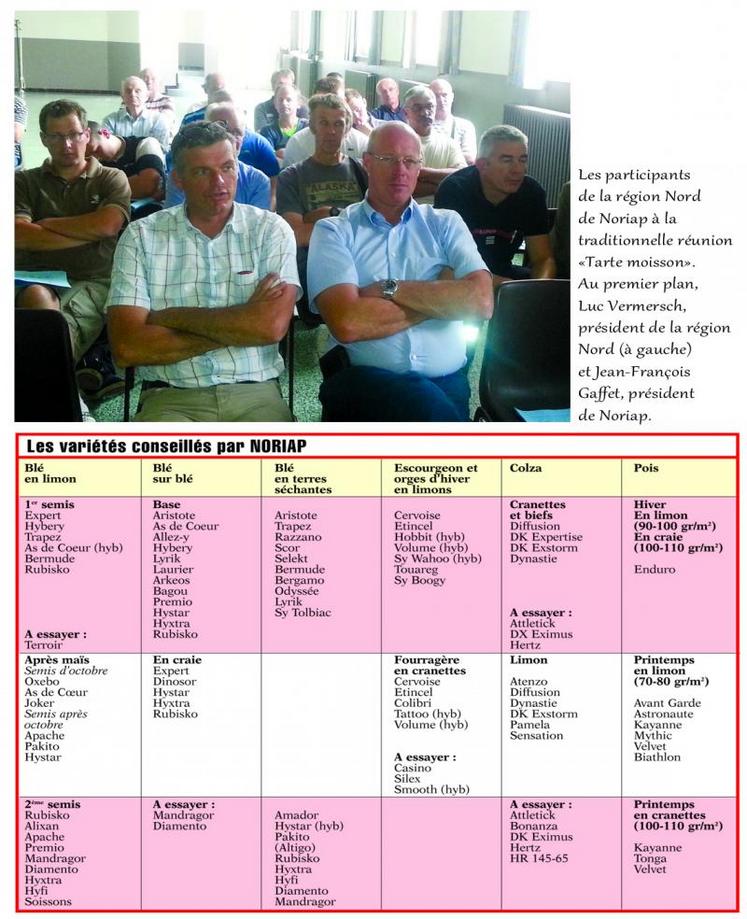 La moisson n’était pas encore tout-à-fait terminée dans le secteur Nord de Noriap ce jeudi 22 août que déjà les adhérents étaient invités à la traditionnelle réunion «Tarte moisson» présidée par Luc Vermersch. Cette réunion visait à tirer les principaux enseignements des récoltes et à prendre connaissance des informations techniques de manière à faire les bons choix de variétés en blés, escourgeons et orges d’hiver, colza et pois.