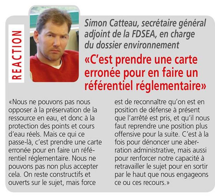 Suivant le cadre de l’arrêté interministériel, et malgré les réticences exprimées de la FDSEA, de la Chambre d’agriculture de la Somme, et de plusieurs dizaines d’avis défavorables exprimés dans la consultation publique, le préfet a signé le 5 juillet dernier un arrêté validant l’addition pour les ZNT des cartes «polices de l’eau» et des cartes IGN, à l’exception des communes des Bas-Champs pour lesquelles le travail initial de 2006 était reconduit. Dans cette zone, si on intègre les traits bleus pointillés des cartes IGN, plusieurs parcelles deviennent non exploitables. Dans la note de synthèse des avis, les services administratifs reconnaissent qu’il est urgent et nécessaire de clarifier et simplifier ces cartographies, et le préfet, Philippe De Mester, s’est engagé auprès de la présidente de la FDSEA à remettre l’ouvrage sur le métier dès septembre.