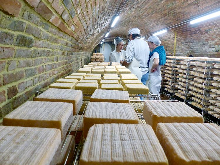 L’étape suivante, le décaillage, nécessite de l’huile de coude et un geste bien maîtrisé. Il s’agit de chasser manuellement 80 % de l’eau à l’aide d’une grille pour obtenir des petits cubes d’un centimètre carré. Ce caillé est mis en moules perforé, de forme carrée évidemment, pour permettre l’égouttage. «Dans la journée, les fromages sont retournés cinq fois, puis sont démoulés à J+1 pour être salés au gros sel. Après une nouvelle journée d’égouttage, ils plongent dans un bain de saumure pour retirer le reste du sérum et favoriser la formation de la croûte», précise la fromagère. Direction alors le hâloir pour une semaine, puis la cave.