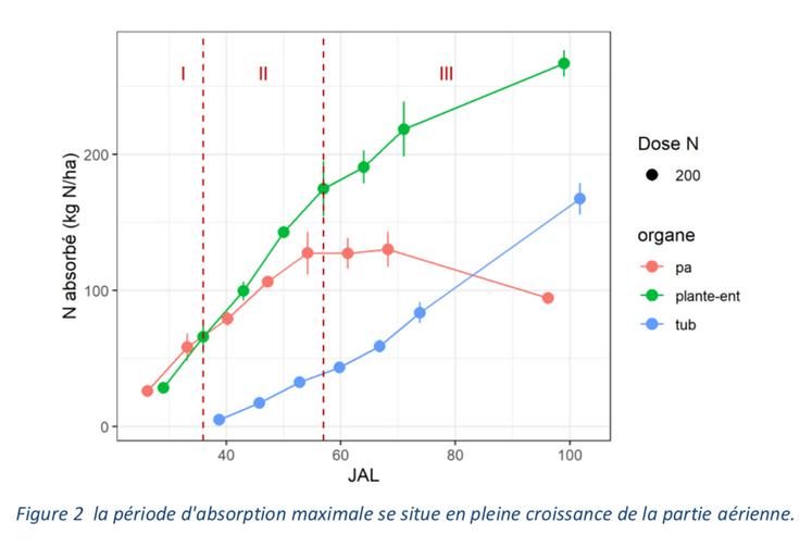 L’efficacité maximale de chaque apport a encore des marges de progression possibles, avec le fractionnement et le pilotage. Les besoins de la pomme de terre sont importants entre la phase d’initiation de la tubérisation et le début de la phase de sénescence. L’absorption de l’azote en effet dépend de la vitesse de croissance. Les outils de pilotage permettent de positionner l’engrais au plus près du maximum des besoins de la plante et de sa capacité d’absorption, et donc de maximiser la quantité d’azote absorbée par la plante par rapport à la quantité d’azote apportée avec l’engrais.