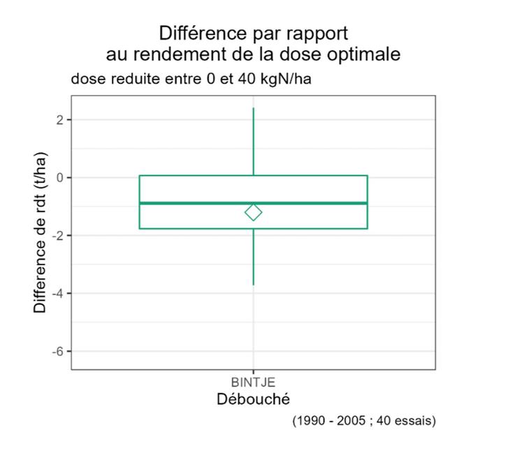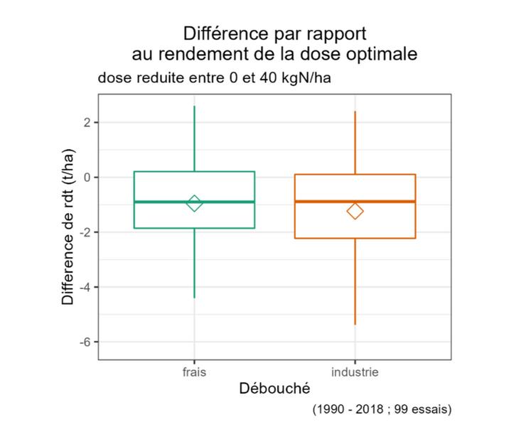 La corrélation entre dose d’azote et rendement est positive, avec un maximum de rendement autour de la dose optimale, valeur au-delà de laquelle le rendement n’augmente plus. En effet, en cas de surfertilisation azotée, le cycle de culture s’allonge en favorisant la croissance foliaire au détriment de la production de tubercules. Ainsi, la teneur en azote des organes aériens et des tubercules augmente, mais la biomasse totale est constante. Les parties aériennes continuent leur développement alors que les quantités d’azote et de de sucres remobilisés vers les tubercules n’augmentent pas. Cependant, il existe en pomme de terre une grande variabilité dans la réponse de la pomme de terre à l’azote. En effet, pour des doses totales optimales comprises entre 100 et 250 kg N/ha, l’analyse de la base de données des essais courbe de réponse à l’azote (1990-2021), montre que pour des réductions de dose comprise entre 0 et 40 kg N/ha par rapport à la dose optimale calculée a posteriori, on observe en moyenne a une baisse de rendement d’environ 1.1 t/ha, avec une variabilité de +2.6 à -6 t/ha. Cette variabilité ne dépend pas autant des variétés ou des doses totales, mais plutôt des conditions spécifiques de chaque situation.