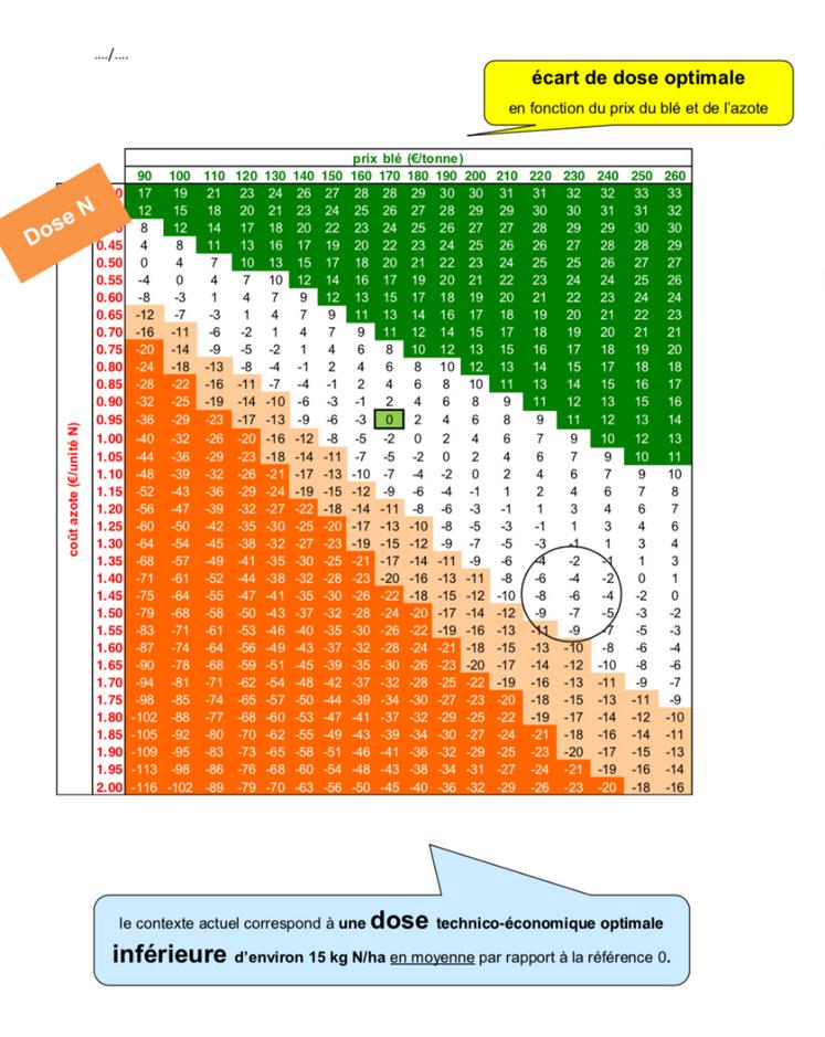À partir de l’analyse des essais courbes de réponse à l’azote réalisés en région, ont pu être constituées différentes matrices illustrant la déformation de l’optimum technique d’azote à apporter dans une parcelle, en fonction de deux critères économiques : le prix de l’azote, mais aussi celui du blé.