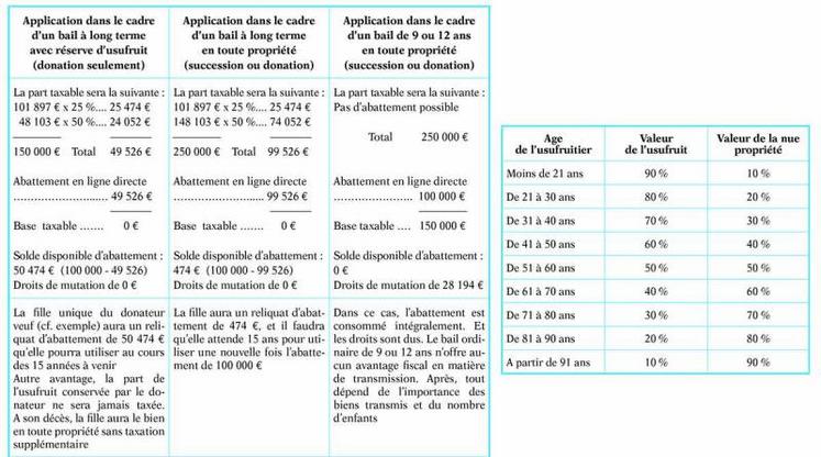 Exemple : aucune donation n’a été effectuée dans les quinze années précédant la donation actuelle. Un agriculteur veuf fait une donation en nue-propriété au profit de sa fille unique de terres agricoles et de bâtiments d’exploitation, s’élevant à 250 000 €. L’agriculteur garde l’usufruit, c’est-à-dire les revenus des biens immobiliers qu’il envisage de donner. Il est âgé de soixante-deux ans, son usufruit (*) est donc de 40 % et la valeur en nue-propriété est de 60 %.