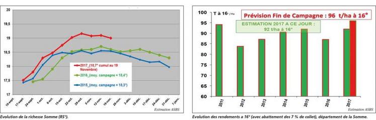 Même les planteurs n’en reviennent pas. A mi-septembre, certains ont enregistré 65 à 70 t/ha alors qu’à la même période, l’an dernier, les rendements étaient en dessous des 65 t/ha. «Actuellement, les moyennes par semaine sont autour de 100 t/ha», commente Jean-Jacques Fatous, directeur adjoint du syndicat betteravier de la Somme, l’ASBS. La progression de la richesse de plus d’un point et demi en deux mois contribue largement à cette augmentation. Du jamais vu. Bilan : les rendements sont de 92 à 95 t/ha à 16°, avec abattement du collet. Bien supérieurs donc aux rendements de la campagne précédente, soit 87 t/ha à 16°. Et le directeur adjoint de conclure : «On va dépasser le record de 2011, qui était à 94 t/ha à 16°.»