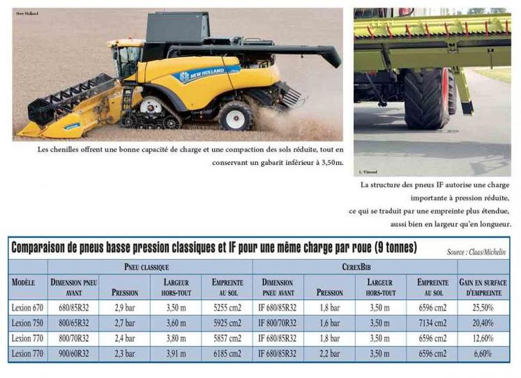 Pneumatiques grand diamètre, technologie IF et chenilles constituent de nouvelles stratégies pour équiper des moissonneuses-batteuses de plus en plus lourdes tout en conservant un gabarit acceptable.
