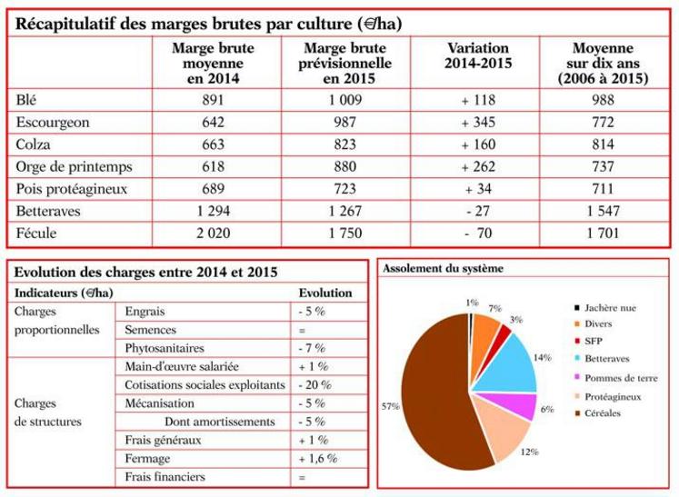 L’année 2015 a été marquée par une faible pression des maladies, à l’origine d’une baisse des charges proportionnelles, principalement sur les postes phytosanitaires et engrais. Les charges de structure ont également été allégées suite à la baisse de 20 % des cotisations sociales exploitants. Côté rendements, les résultats ont été excellents en céréales. Ces éléments expliquent l’augmentation des marges brutes pour certaines cultures telles que le blé, l’escourgeon, le colza, l’orge de printemps et les pois protéagineux.