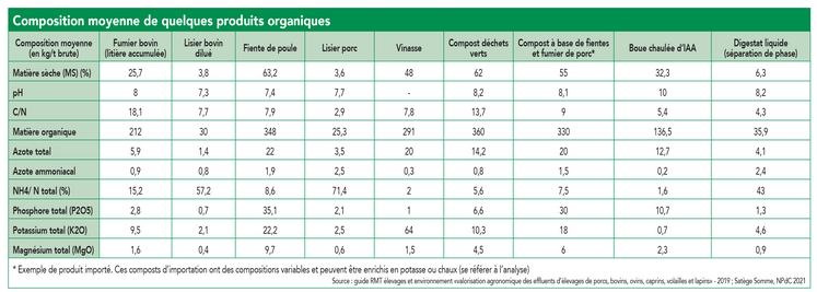 La difficulté avec les produits organiques, c’est que leur composition varie. La conduite d’un élevage (niveau de paillage, type d’alimentation...) va par exemple influencer la composition des fumiers, même pour leurs conditions de stockage (durée bord de champs…). Ainsi, les valeurs moyennes annoncées dans le tableau ci-après montrent dans certains cas, une certaine disparité (la teneur en azote total d’un fumier de bovin oscille entre 4,8 et 7,8 kg N/t – un apport de 30 t/ha peut donc varier entre 144 et 234 kg d’azote). La variabilité est moindre pour des produits stabilisés, comme les composts. Pour bien prendre en compte un produit organique, il peut donc s’avérer opportun de réaliser de temps en temps une analyse, à condition, bien évidemment, d’effectuer un prélèvement représentatif. L’analyse agronomique complète coûte environ 50 € et permettra ainsi une optimisation de vos effluents.