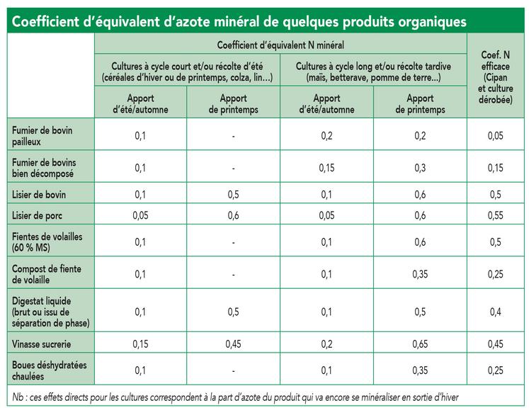de fumier de bovin permettra un apport de 180 kg d’azote dont 54 u N/ha en effet direct assimilable pour la culture (30 %). S’il est apporté en été/automne devant la culture de printemps, c’est 15 % (27 u N/ha) qui bénéficiera pour la culture (une autre partie sera restituée par la Cipan). Cet écart est encore plus important pour les produits qui minéralisent vite (disponibilité de l’azote par effet direct de 60 % pour les fientes apportées au printemps et 10 % si apport d’été/automne).
