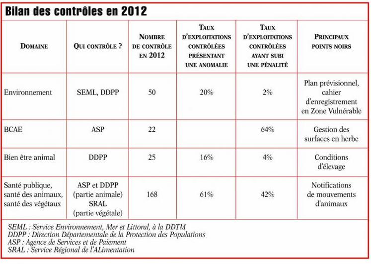 Sur ces 265 exploitations contrôlées, 126 (soit 30%) ont fait apparaître une anomalie donnant lieu à une pénalité pour 80 cas. Cette pénalité a été de 1 % chez 48 agriculteurs, de 3% chez 29 exploitants, de 5%, 6% et 9% dans les trois derniers cas. A noter qu’en 2012, il n’y a pas eu d’anomalie portant à 20% de pénalités, ni de refus de contrôle, ce qui témoigne aux dires des contrôleurs présents d’un climat «apaisé».