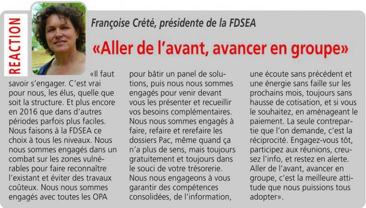 Sur le plan syndical, le conseil a décidé de maintenir pour la deuxième année consécutive la cotisation syndicale au même montant, et de simplifier tout en abaissant le montant des appels des sections spécialisées, notamment viande bovine et pomme de terre. Le conseil repousse enfin la date de prélèvement au 31 mars pour la cotisation, et permet aux agriculteurs qui le souhaitent un paiement décalé si besoin. Enfin, après deux années où ces secteurs ont passablement souffert comparativement au reste du territoire, les communes des «Bas Champs» retrouvent un appel normal, sur proposition des présidents cantonaux concernés validée par le conseil. Ce faisant, le conseil de la FDSEA a décidé de préserver pour les adhérents une ressource constante d’animation, d’information, de formation, de conseil et de défense, laquelle est de plus en plus sollicitée chaque année, tout en contenant le coût pour l’adhérent, et en adaptant la date de paiement au mieux de ses dispositions. Le seul impératif, et c’est bien normal dans le syndicalisme, c’est de s’engager dès l’appel de cotisation.