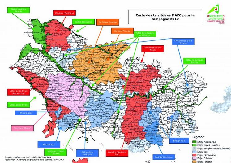 L’Etat et les Agences de l’eau ont défini des zones prioritaires en faveur de différents enjeux : qualité de l’eau, biodiversité, zones humides et lutte contre l’érosion. Sur ces zonages, des opérateurs sont en charge de construire et d’animer un projet agro-environnemental adapté à l’enjeu spécifique de leur territoire. Sur le département de la Somme, douze structures se sont porté «opérateur» selon les zonages définis (cf. carte). Pour décliner ce projet, les opérateurs proposent un certain nombre de mesures, selon les systèmes de production («herbe», «grandes cultures», «entretien du pay--sage», «mesures systèmes»).