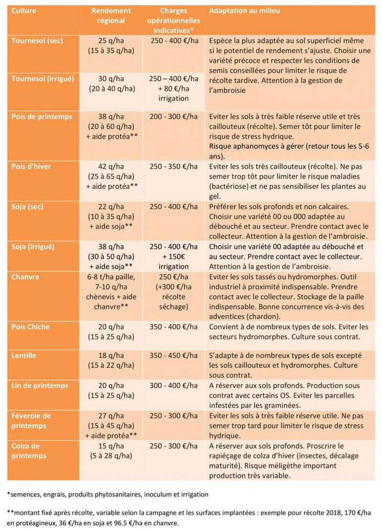 Le soja, le pois, le lin oléagineux, le chanvre, la féverole, voire le colza de printemps, valorisent les sols profonds. Le tournesol, la lentille et le pois chiche sont des espèces mieux adaptées aux sols plus superficiels même si leur potentiel de rendement s’ajuste.