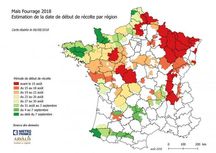 Pour chaque «région», les experts d’Arvalis ont défini le groupe de précocité dominant et la date médiane des semis en 2018. Avec les données de températures de l’année en cours et les données statistiques sur les semaines à venir, il est possible de prévoir une période à laquelle le stade de récolte sera atteint. Cette prévision est régulièrement mise à jour pour prendre en compte le climat de l’année. Afin d’étaler la période de chantier, et pour éviter les récoltes tardives à taux de matière sèche trop élevé, la carte propose une période de début de récolte par région.