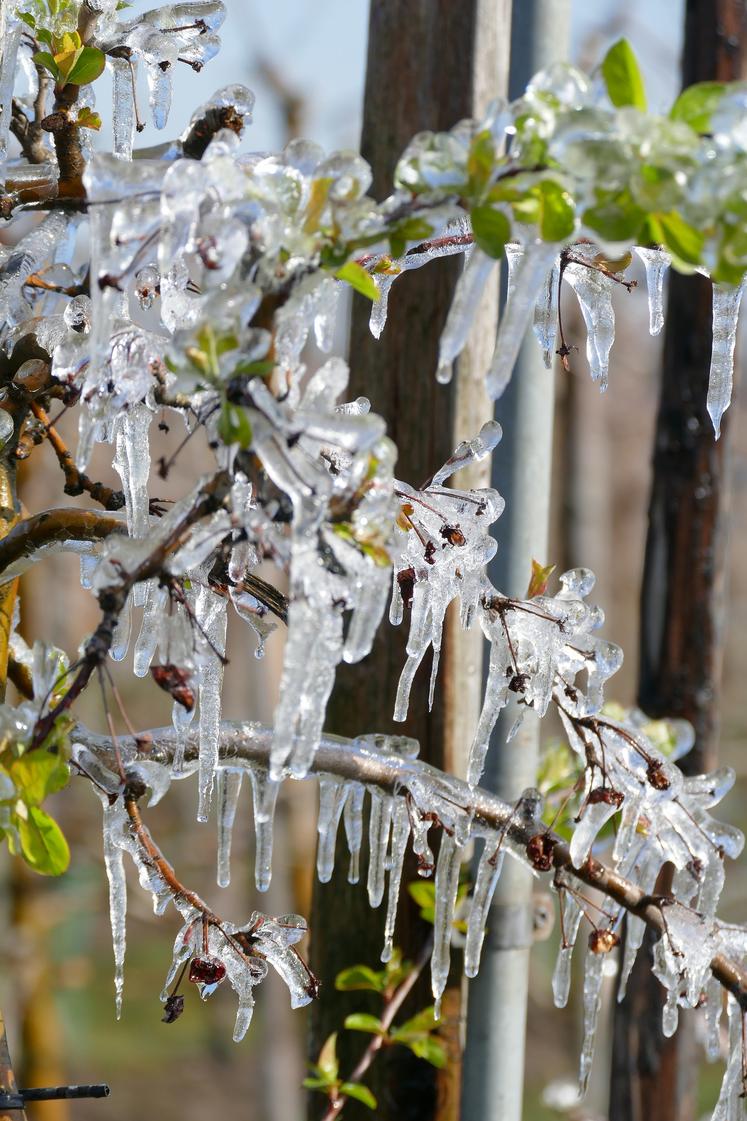 Ses pommiers et poiriers, au stade de décollement des bourgeons floraux, n’ont pas résisté aux - 4,5°C que le thermomètre a affiché pendant trois nuits, les 5, 6 et 7 avril, «soit - 6 à - 7°C en équivalent température humide». L’épisode de froid a été d’autant plus violent qu’il s’agit de gelées noires, poussées par des vents d’Est. «Il faisait aussi froid au sol qu’à 1 m de hauteur». Martin Noyon n’est pas équipé en système de protection des cultures contre le gel, mais il pense qu’il n’aurait de toute façon rien pu faire. «Quand il fait aussi froid, aussi longtemps, on peut difficilement lutter.» D’après lui, il s’agirait de «gelées historiques», dont des précédents auraient été vécus en 1991 et 1971. «Je pourrais mieux estimer l’impact à la floraison des arbres», précise Martin Noyon.