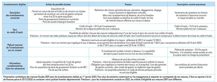 Suite au vote de la loi de finances, le dispositif d’encouragement fis-cal à l’investissement en forêt a évolué. Il se décline désormais en trois volets seulement : DEFI Acquisition, DEFI Assurance, DEFI Travaux. Il propose des seuils et des taux révisés (voir tableau ci-joint). Les principales évolutions apportées sont :