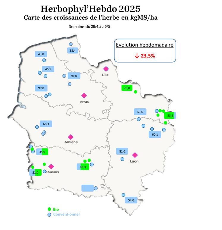 La gestion du pâturage, des situations contrastées : aux vues de l’hétérogénéité sur l’avancement du premier cycle de pâturage, il y a peut-être la possibilité de débrayer des parcelles pour la fauche. Avant de prendre la décision il est important de calculer le nombre de jours d’avance (15 à 18 jours), et de quantifier le volume de stock sur pieds.
