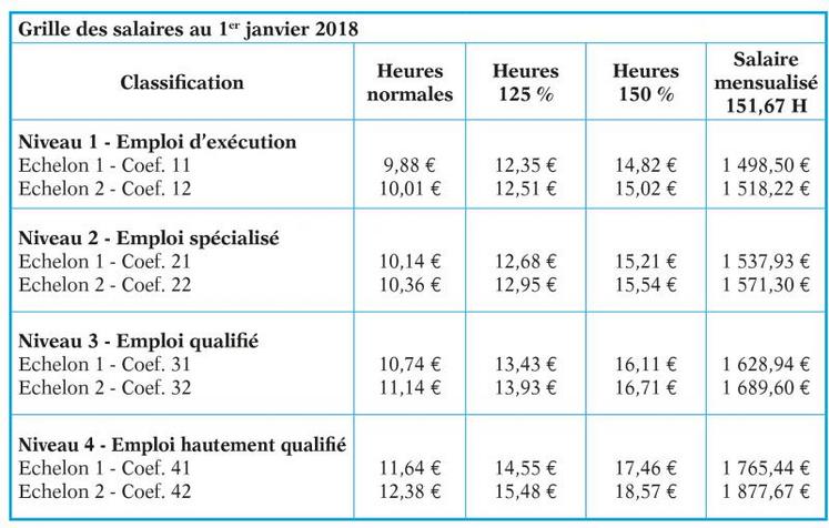 La nouvelle grille des salaires, applicable à compter du 1er janvier 2018, est présentée ci-contre (sous réserve de validation après délai légal d’opposition).