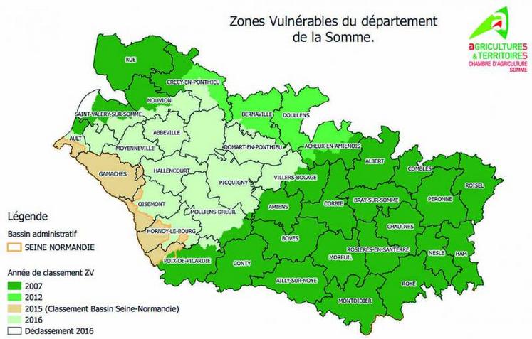 Les arrêtés de délimitation du 13 mars 2015 et du 18 novembre 2016 des zones vulnérables aux nitrates ont conduit à zoner le dernier tiers du département de la Somme, qui concentre l’essentiel de l’élevage, à l’exception de la commune de Cayeux-sur-Mer. Les éleveurs doivent se doter de capacités forfaitaires de stockage, qui peuvent être minorées par un rythme d’épandage augmenté en jouant sur l’assolement. Ce stockage agronomique doit être justifié par la production d’un diagnostic de l’exploitation (Dexel).
