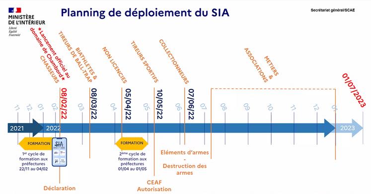 La première catégorie de détenteurs d’armes à être concernée par le SIA sont les chasseurs. On en compte environ 1 million en France, ce qui en fait une cible privilégiée et prioritaire. Les autres catégories de personnes détentrices d’armes – tireurs sportifs (ball-trap, tir sur cible) et biathlètes – sont aussi concernées mais profitent d’échéances différées pour éviter l’embouteillage sur la plateforme (voir schéma). À la création du compte personnel, le détenteur reçoit un numéro SIA, lequel devient son numéro personnel de détenteur d’armes qui le suivra tout au long de sa vie. Ce numéro sera à communiquer à un armurier à chaque visite pour acquérir une arme, la faire réparer ou la vendre. Toujours à l’ouverture du compte, le détenteur a directement accès à son râtelier numérique où on y retrouve toutes les armes détenues.