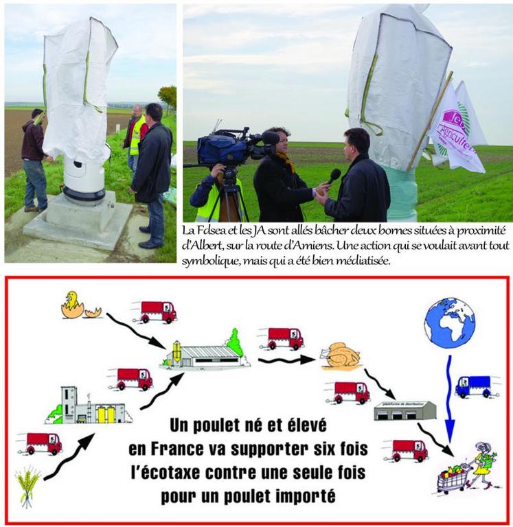 Xavier Beulin l’avait annoncé le week-end dernier, le monde agricole s’est mobilisé le 22 octobre dernier contre le principe d’application de l’écotaxe poids lourds. Dans le département de la Somme, la Fdsea et les Jeunes Agriculteurs avaient choisi de dénoncer les modalités de cette taxe par le bâchage des deux bornes situées à proximité d’Albert, sur la route d’Amiens. Une action qui se voulait avant tout symbolique, en cette pleine période de travaux, mais qui a eu la portée recherchée : faire prendre conscience à tous de cette nouvelle charge distorsive pour l’économie agricole et rurale, car elle a permis de faire le lien entre l’agriculture, les entreprises agroalimentaires et l’économie connexe sur les territoires ruraux.