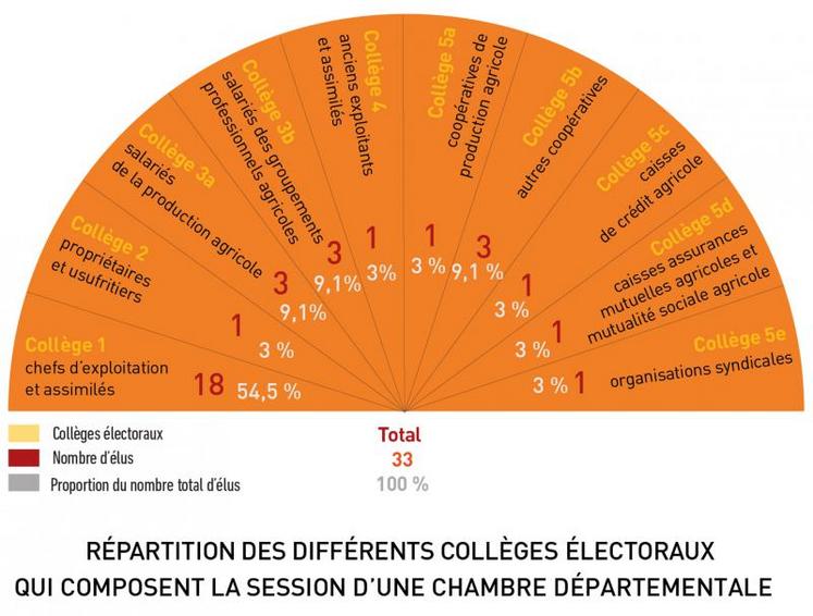 Les Chambres d’agriculture départementales sont composées de trente-trois membres, élus au suffrage direct pour une durée de six ans et répartis dans dix collèges : cinq collèges individuels et cinq collèges des groupements professionnels agricoles. A cela s’ajoutent le ou les conseillers du CRPF (Centre régional de la propriété forestière), élus par le collège des propriétaires forestiers (élection décalée).