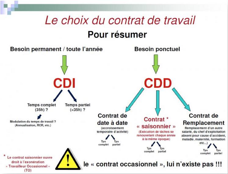 Tout d’abord, choisir entre CDI et CDD selon qu’il s’agit de faire face uniquement à des tâches précises et temporaires, ou au contraire, à un travail qui rentre dans l’activité normale et permanente de l’exploitation. Enfin, votre volume d’activité vous orientera vers un contrat de travail à temps complet ou à temps partiel.