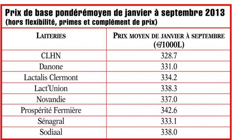 Début 2013, Les producteurs avaient menédes actions répétées dans les grandes surfaces face à une évolution des charges intenable fin 2012. Cela a abouti à un accord national avec le ministère. La grande distribution s’engageait à compenser une partie de la hausse des charges des producteurs par le biais d’un pied de facture avec un retour de 25 euros aux producteurs sur le second trimestre 2013. Les 25 euros ont été appliqués sur le second trimestre, au départ sous forme d’avance remboursable et c’est seulement au mois de juillet qu’ils ont été intégrés dans le prix de base par une majorité des laiteries. Des groupes nationaux récupèrent aujourd’hui ces avances. Le tableau ci-dessus reprend la moyenne pondérée des prix de base 2013 de janvier à septembre, hors flexibilité, primes et complément de prix, pour chacune des laiteries de la Somme.