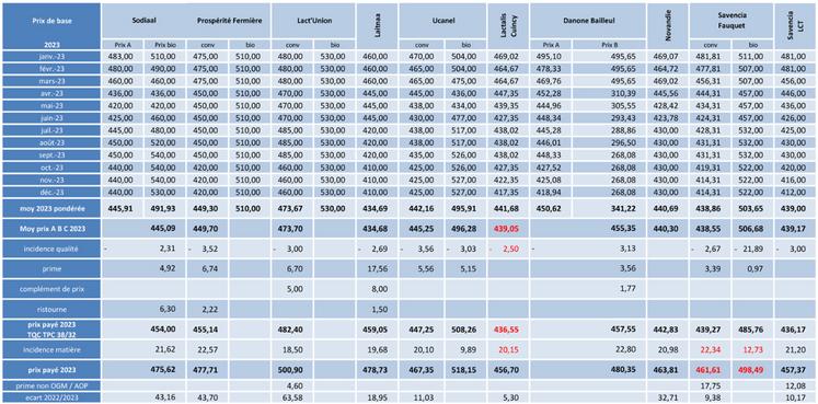 En 2023, le prix du lait a évolué positivement d’environ 30 € par rapport à 2022. Il atteint un niveau historique début 2023 et s’établit à 444 € en moyenne annuelle France pour le lait conventionnel standard (38 g/l MG – 32 g/l MP).