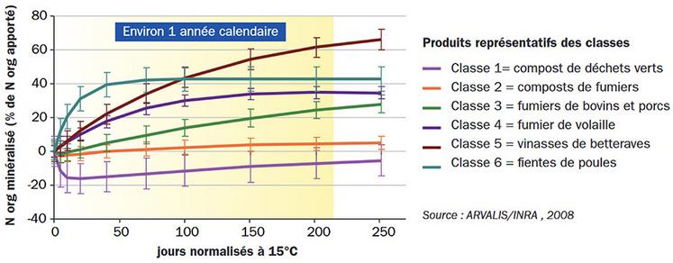 Les cinétiques de minéralisation de l’azote organique présentées en schéma 1 montrent par exemple que les composts minéralisent très peu (voire même présentent des phénomènes d’organisation) ; à l’exception des effluents avicoles (même compostés) qui minéraliseront assez vite (30 à 40 % pour certains d’entre eux). Le fumier de bovin minéralisera de son côté assez progressivement et nous pouvons tabler sur une minéralisation potentielle de l’azote de 20 à 40 % selon son niveau de paillage.