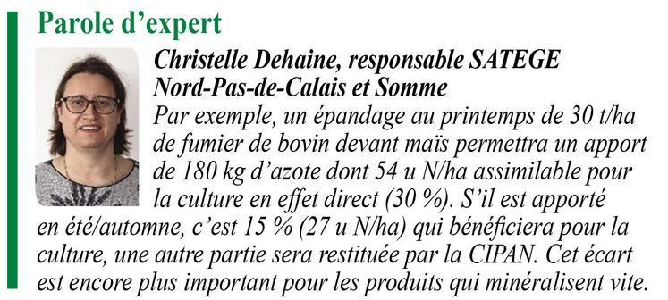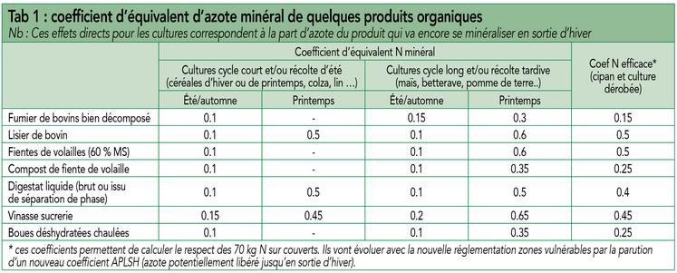 L’efficacité azotée dépendra aussi de leur date d’apport (cf. tab 1). Pour bien valoriser les effluents riches en azote ammoniacal ou qui minéralisent vite (lisiers, digestats liquides, effluents avicoles), il est préférable de les épandre au plus près des besoins des cultures, et donc de privilégier si possible les apports de printemps. Néanmoins, les conditions d’épandage au printemps sont quelques fois délicates (tassement des sols, conditions climatiques, etc.). Apportés en été/automne, ils contribueront beaucoup moins pour la culture de printemps. Dans ce cas, l’azote sera en partie valorisé par le couvert d’interculture (CIPAN) et restitué progressivement par la biomasse du couvert hivernal.
