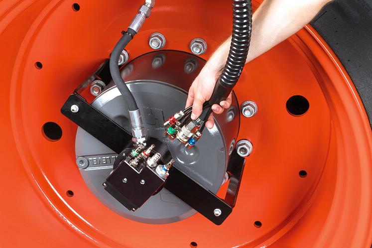 L’équipementier Sodijantes commercialise depuis 2016 son propre système de télégonflage pourvu exclusivement de tuyauteries externes. Baptisé Agriwin et compatible avec le pilotage Isobus, il est conçu pour les tracteurs et les véhicules remorqués. Il fonctionne à partir du compresseur de freinage ou à l’aide de modèles optionnels délivrant 550 ou 3 000 l/min. Le plus gros assure, selon le fabricant, le gonflage en 10 minutes des 10 pneus d’un ensemble. La firme allemande PTG, rachetée par Michelin en 2017, retient aussi des lignes extérieures pour les quatre roues, mais les remplace, à l’arrière, par des joints tournants internes, plus discrets, sur les tracteurs équipés d’un essieu pourvu d’arbres à crémaillère. Disponible en version Isobus, la solution PTG s’accompagne en option d’un compresseur à vis délivrant de 1 000 à 2 000 l/min, voire jusqu’à 4 000 l/min pour desservir un véhicule remorqué, tel qu’une tonne à lisier. Elle se décline en versions à simple ligne avec vanne manuelle ou à double ligne avec valves pneumatiques pilotées, qui s’ouvrent et se ferment uniquement au moment du gonflage ou du dégonflage. Cette seconde architecture évite la perte de pression en cas d’arrachage accidentel d’un tuyau. PTG annonce travailler avec les tractoristes, à l’instar de New Holland et Case IH, qui prévoient, sur leurs tracteurs de