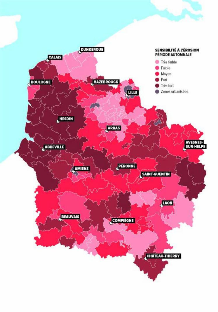 Le ord-Pas-de-Calais, ar exemple, est traversé d’Ouest en Est par une zone où la sensibilité à l’érosion annuelle est très forte. Val de Canche et d’Authie, Haut-Pays d’Artois, Ternois ou Valenciennois sont prioritairement impactés (voir carte ci-contre). Cette sensibilité décroît au fur et à mesure que l’on s’éloigne vers l’Est. Les secteurs de l’Artois, du Cambrésis et de l’Avesnois peuvent néanmoins être touchés par des épisodes orageux violents entraînant des dégâts, comme ce fut le cas en 2018. «Le phénomène d’érosion peut être lié à plusieurs facteurs : des épisodes de pluies de forte intensité, des sols limoneux et sablo-limoneux particulièrement sensibles, un relief parfois abrupt, mais surtout des pratiques culturales qui favorisent les cultures de printemps et la présence de machines au poids toujours plus important», indique François Derancourt, expert en érosion à la Chambre d’agriculture du Nord-Pas-de-Calais. Pour contrer cette problématique, les premières opérations (travaux agronomiques et ouvrages légers) ont vu le jour dans les années 1980. Elles se sont amplifiées durant les deux décennies suivantes, mais surtout depuis 2010 à l’échelle de la région avec la mise en place d’aménagements plus variés. «A ce jour, 3 311 ouvrages d’hydraulique douce ont été réalisés dans le Nord-Pas-de-Calais, annonce François Derancourt. Parmi eux, on dénombre 2 292 fascines sur 43 km, la plantation de 605 haies sur 78 700 mètres et l’implantation d’environ 13 ha de bandes enherbées.» Durant l’hiver, plusieurs nouveaux agencements vont être entrepris.