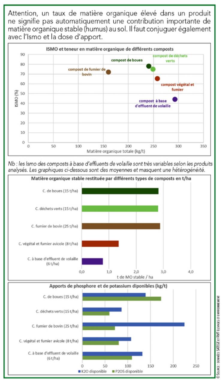 Selon les matières entrantes, les caractéristiques d’un compost vont donc être différentes. Le choix dépendra des besoins de l’agriculteur. Si c’est l’apport de matière organique stable qui est recherché, il est préférable de se tourner vers des composts de déchets verts ou des composts riches en matière organique et avec un Ismo élevé. Si c’est un compromis apport de matières organiques et éléments fertilisants qui est souhaité, les composts d’effluents d’élevage seront plus intéressants. Dans tous les cas, ne pas hésiter à demander les résultats d’analyse récentes avec la teneur en Ismo et le choix devra s’apprécier en comparant coûts et bénéfices.