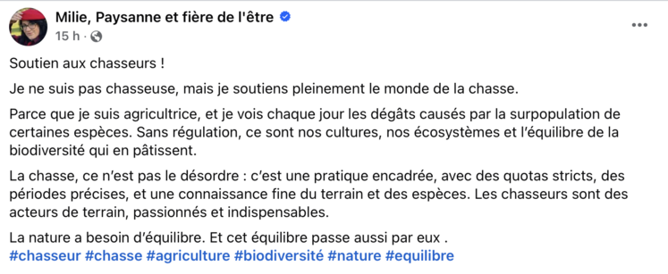 Si la plupart de ses publications racontent son quotidien d’agricultrice, et qu’elle partage des actualités en lien avec le monde agricole, elle est d’une certaine manière « sortie du bois » ce jeudi 26 juin en publiant un message de soutien aux chasseurs.