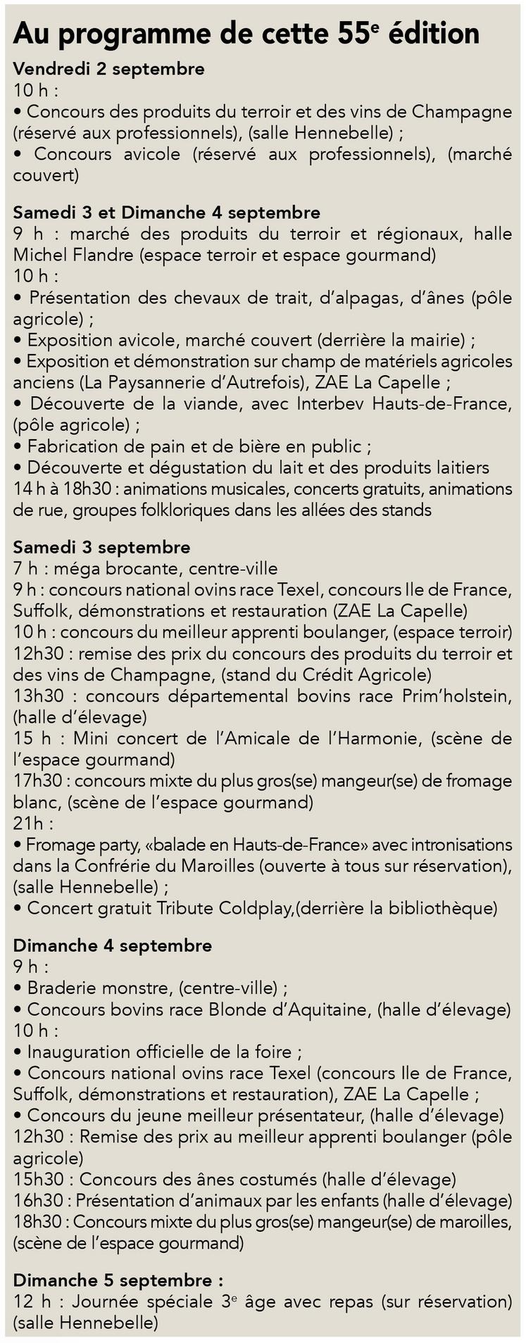 Cette année aura lieu le concours national ovins de race Texel. Le programme sera agrémenté de différents concours primés (produits du terroir et vins de champagne, bovins, ovins, avicoles), de concours folkloriques (plus grand mangeur(se) de fromage blanc, plus grand(e) mangeur(se) de maroilles) mais aussi de groupes musicaux déambulant dans les allées et du concert «Tribute Coldplay» le samedi soir.