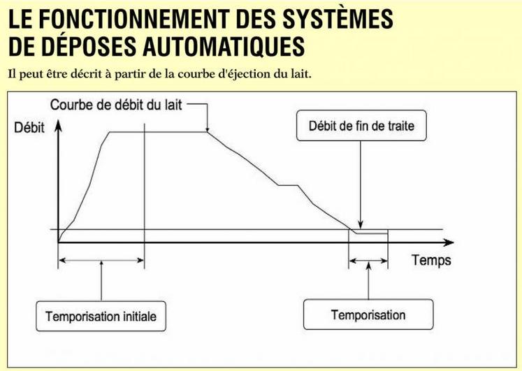 • La temporisation initiale : c'est la durée en début de traite pendant laquelle le système de dépose est inactif, même en absence de lait. Ce délai permet au trayeur de brancher les faisceaux trayeurs et évite les déposes intempestives avant le début de l'écoulement du lait qui peut parfois débuter un peu après la mise en place du faisceau.