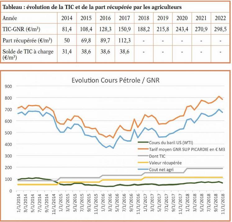 Il en ressort plusieurs points très différents : en premier lieu, le montant de la TIC est d’ores et déjà élevé puisqu’il est passé de 81,4 à 188,2 €/m3 de 2014 à 2018, mais il va continuer à monter pour atteindre 298,5 €/m3 à l’horizon 2022 (du fait de l’impact direct de la mise en place de la taxe carbone) ! Bref, nous ne sommes pas à la veille d’une détente sur le sujet, surtout en phase de prix du pétrole ferme. Toutes choses égales par ailleurs, la poursuite de la hausse de la TIC laisse entrevoir à court terme un prix du GNR au-delà de 1 € le litre. Dans le même, depuis sa mise en place en 2014, le dispositif de récupération de TIC a permis de neutraliser jusqu’à présent les hausses de taxe en faveur des agriculteurs, dans un plafond de 38,6 €/m3.