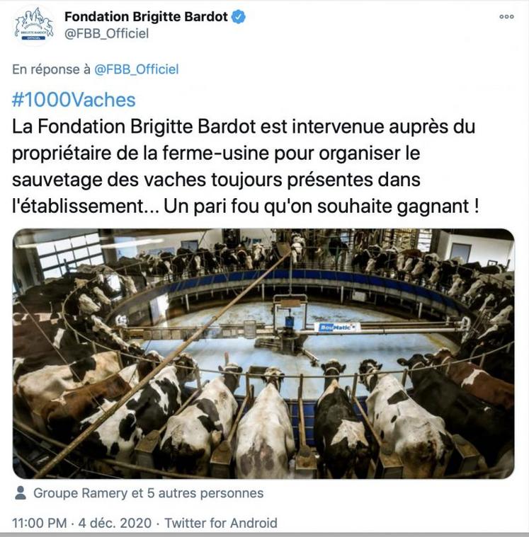 A l'heure où un certain nombre de questions se posent sur l'avenir de la vingtaine de salariés du site de la Ferme des 1000 vaches, et que l'on sait que le troupeau laitier devrait être quant à lui vendu pour une partie et réformé pour l'autre – une manière de faire qui ne surprend pas les éleveurs, quel que soit la taille de leur élevage -, la Fondation Brigitte Bardot s'est illustrée sitôt l'annonce de l'arrêt de l'activité laitière par la SCEA de la Côte de la justice. Comment ? En annonçant depuis ses comptes Facebook et Twitter vouloir « organiser le sauvetage des vaches toujours présentes dans l'établissement », afin de les accueillir « dans son arche de BB ». Elle affirme ensuite être intervenue « auprès du propriétaire de la ferme-usine » et qualifie de « victoire pour les opposants (dont la FBB) à la ferme-usine » la cessation de l’arrêt de la production laitière de cette exploitation.