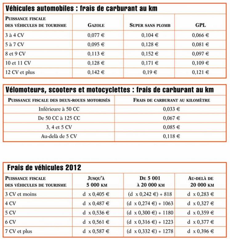 Le barème est le même que l’an dernier et il est plafonné cette année pour les voitures de 7 cv. Il existe également un barème forfaitaire pour les cyclomoteurs et les autres deux roues.