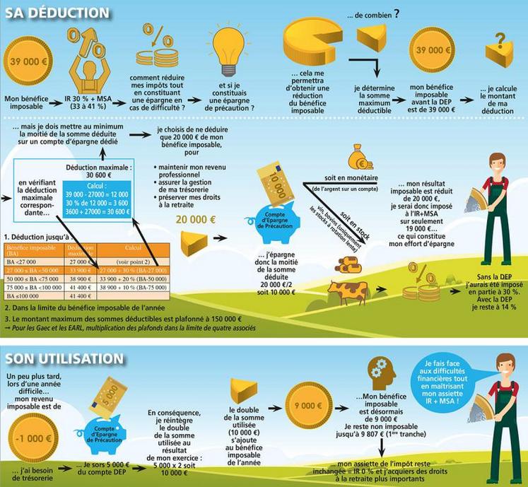 Cette déduction pour épargne de précaution (DEP) peut être pratiquée à la condition d’inscrire une somme comprise entre 50 % et 100 % de son montant sur un compte ouvert auprès d’un organisme financier. L’inscription doit intervenir dans les six mois de la date de clôture de l’exercice et doit figurer au bilan de l’exploitation.