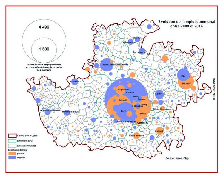De 2008 à 2014, les pertes d’emploi se sont localisées majoritairement au sein de l’unité urbaine d’Amiens(1), notamment à Amiens (- 4 500 postes) et Dury (- 700 postes), mais aussi à Saleux, Longueau, Rivery et Camon. Des chiffres à relativiser cependant, car, par exemple, Salouël a bénéficié du transfert du site amiénois de l’hôpital Nord sur le nouvel hôpital Sud (+ 1 500 postes). L’emploi salarié s’est aussi développé à Glisy (+ 900 postes) et à Boves